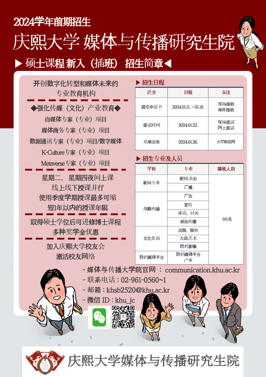 2024学年 前期招生 庆熙大学 媒体与传播研究生院 硕士课程 新入(插班)招生简章 등록일 23-12-28 10:56 작성자 media 조회수 1,173 이전글[focus] 2023학년도 전기 학위수여식 개최 다음글 2024학년도 전기 석사과정 신(편)입생 추가 모집 (1/11(목)~1/19(금)) 목록