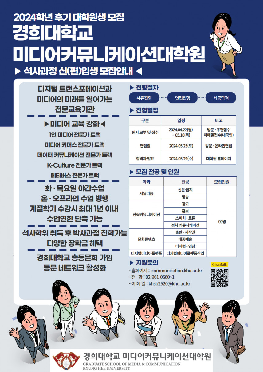 2024학년도 후기 석사과정 신(편)입생 모집 안내 등록일 24-04-15 12:56 작성자 media 조회수 793 이전글2024학년도 후기 석사과정 신(편)입생 모집 안내 (카드뉴스) 다음글 2024学年 后期招生 庆熙大学 媒体与传播研究生院 硕士课程 新入(插班)招生简章 목록