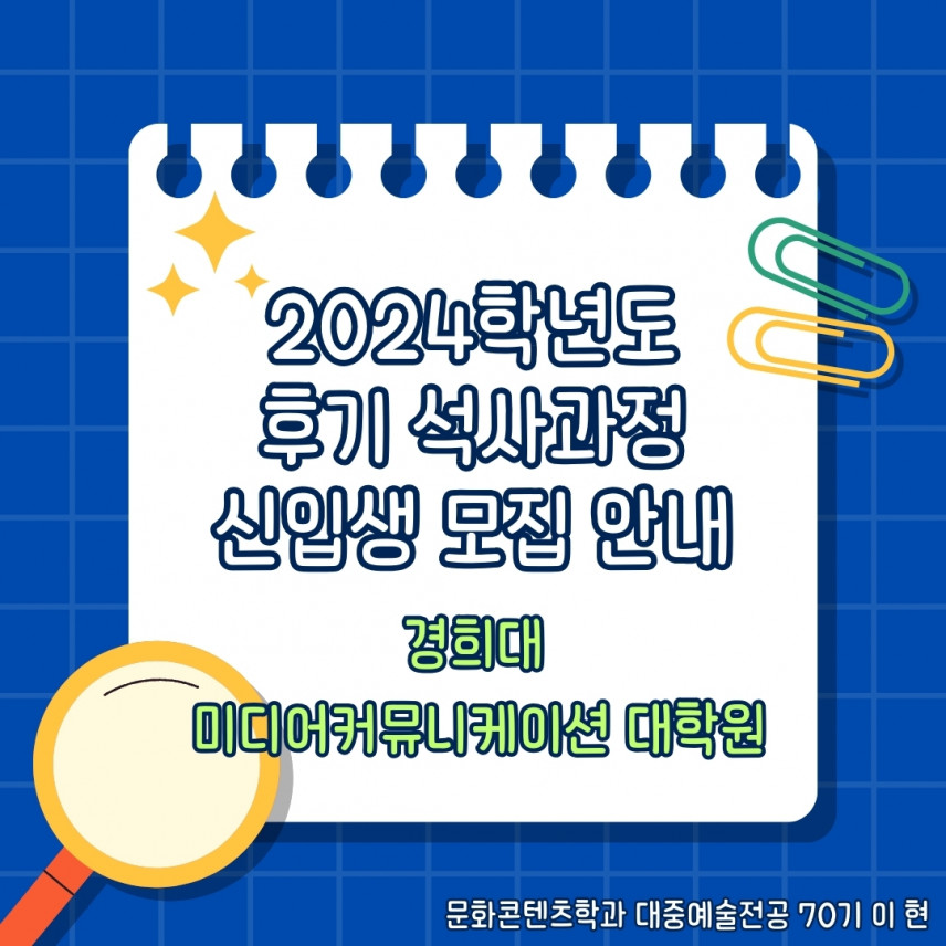 2024학년도 후기 석사과정 신(편)입생 모집 안내 (카드뉴스) 등록일 24-04-15 12:57 작성자 media 조회수 841 이전글2024년도 후기 석사과정 신(편)입생 모집 안내 (Chinese) 다음글 2024학년도 후기 석사과정 신(편)입생 모집 안내 목록