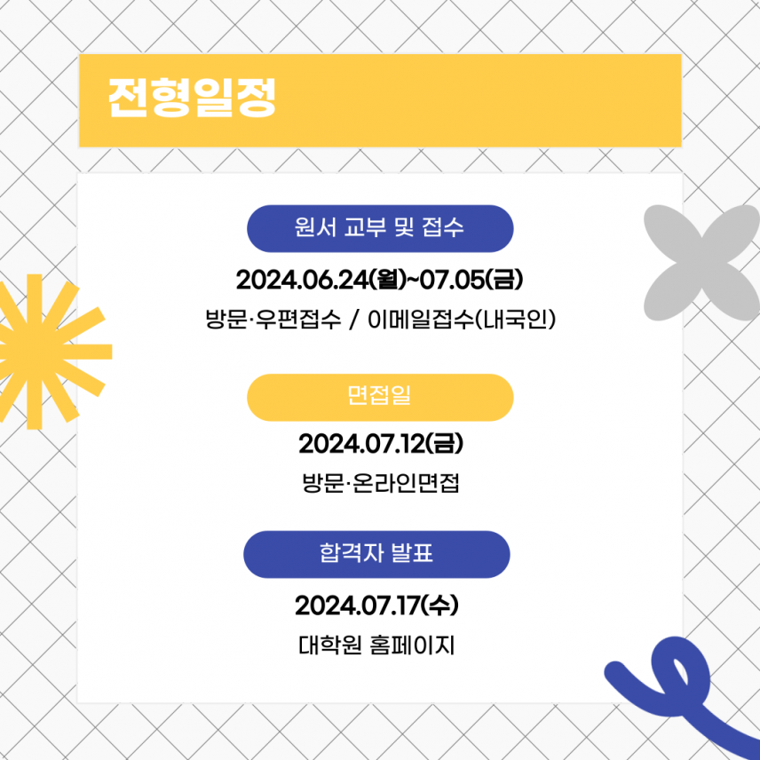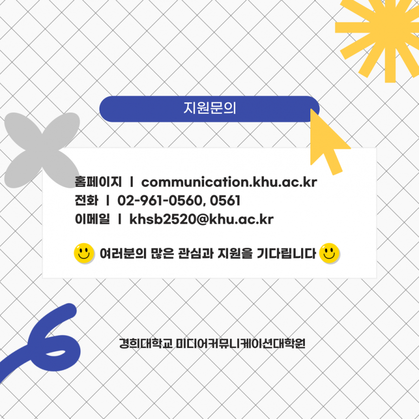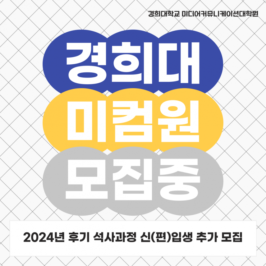 2024학년도 후기 미디어커뮤니케이션대학원 석사과정 신(편)입생 추가 모집(카드뉴스) 등록일 24-06-28 09:42 작성자 media 조회수 667 2024학년도 후기 미디어커뮤니케이션대학원 석사과정 신(편)입생 추가 모집(카드뉴스) 이전글2025학년도 전기 미디어커뮤니케이션대학원 석사과정 신(편)입생 모집 다음글 2024学年 后期招生 庆熙大学 媒体与传播研究生院 硕士课程 新入(插班)招生简章 목록