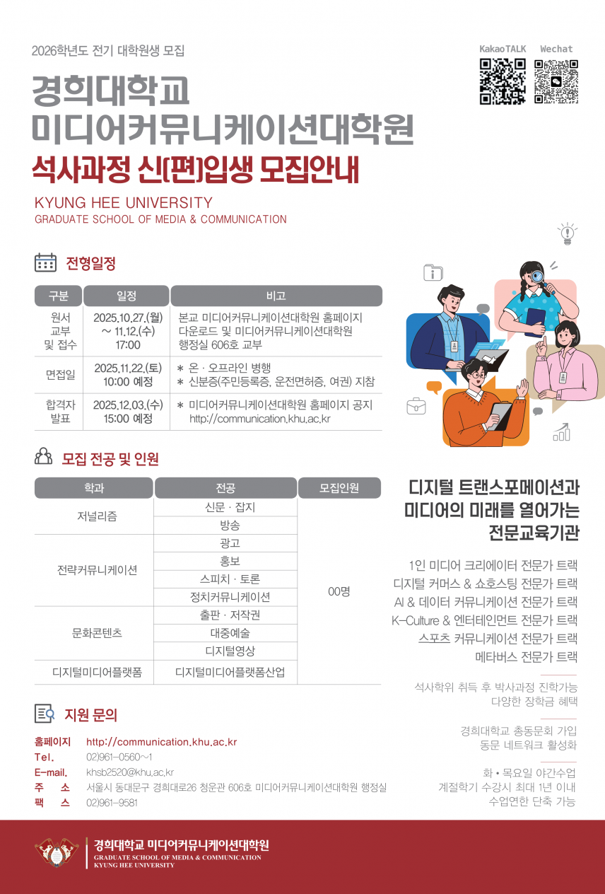 2026학년도 전기 미디어커뮤니케이션대학원 석사과정 신(편)입생 모집 등록일 25-10-02 10:17 작성자 media 조회수 178 다음글 2025학년도 후기 미디어커뮤니케이션대학원 석사과정 신(편)입생 추가 모집 목록