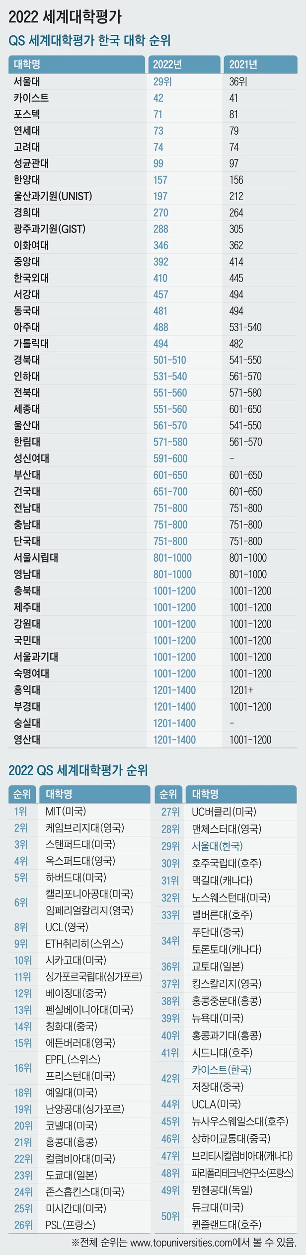 영국의 글로벌 대학 평가 기관 QS(Quacquarelli Symonds)가 6월 9일 새벽에 발표한 ‘2022