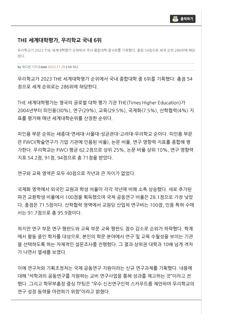 [대학주보] THE 세계대학평가, 우리학교 국내 6위 등록일 23-12-05 11:14 작성자 media 조회수 1,002 이전글경희대 미디어커뮤니케이션대학원 12월9일 ‘송년 홈커밍 데이’ 다음글 [focus] 대학원생의 지속가능한 연구를 위해 목록