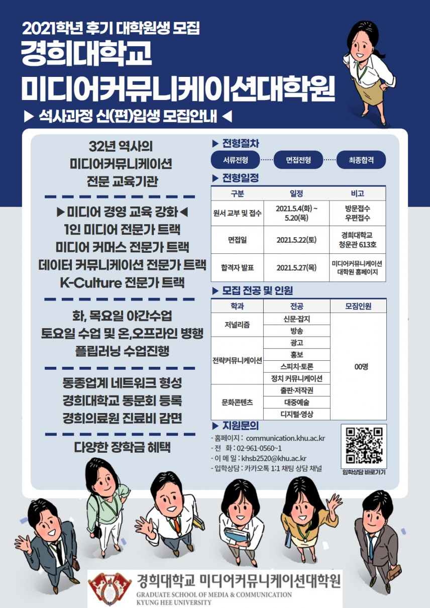 2021학년도 후기 석사과정 신(편)입생 대학원생 모집 등록일 21-04-14 13:52 작성자 media 조회수 2,033 이전글2021학년도 후기 석사과정 신(편)입생 대학원생 모집(中文) 다음글 [Focus] 2021학년도 신입생 온라인 입학식 거행 목록