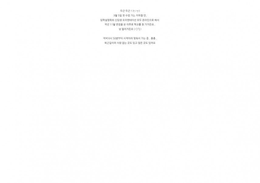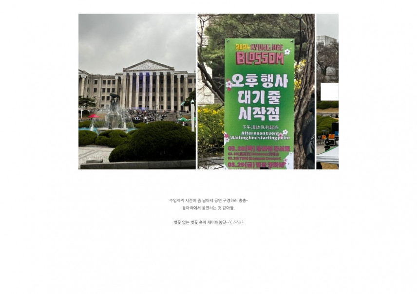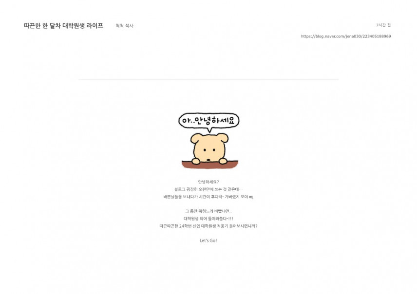 따끈한 한 달차 대학원생 라이프 [출처] 따끈한 한 달차 대학원생 라이프 |작성자 젼 등록일 24-04-04 16:18 작성자 media 조회수 1,089 대학원생 학교생활 vlog 소개https://blog.naver.com/jena030/223405188969 이전글[경희대도서관] 도서관에 전자책을 신청해보세요! 다음글 2023 경희대학교 구성원 인식 및 만족도 조사 결과 안내 (대학원) 목록