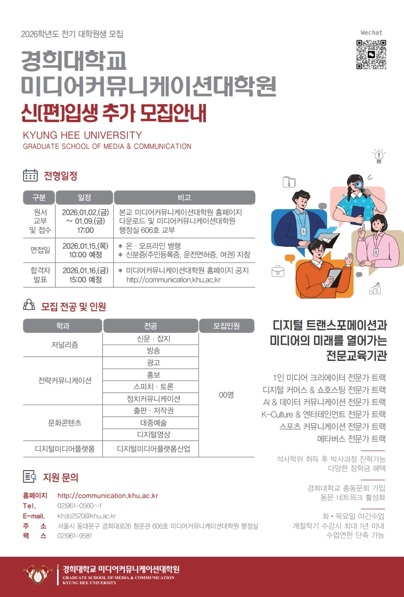 2026학년도 전기 미디어커뮤니케이션대학원 석사과정 신(편)입생 추가 모집 등록일 25-12-31 10:05 작성자 media 조회수 28 다음글 2026학년도 전기 미디어커뮤니케이션대학원 석사과정 신(편)입생 모집 목록