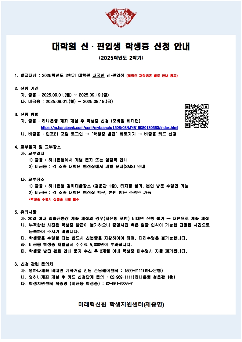 [학생증] 2025학년도 2학기 대학원 신·편입생 학생증 신청안내 등록일 25-08-21 13:28 작성자 media 조회수 1,124 2025학년도 2학기 하나은행 영하나 학생증 신청 프로세스.pdf (다운로드횟수:420) 인포21 비금융 학생증 신청 프로세스.pdf (다운로드횟수:413) 이전글[학생증] 2025학년도 2학기 외국인 신·편입생 학생증 신청안내 다음글 [2024 학년도 후기 학위수여식] 평화의 전당 주차 통제 안내 목록