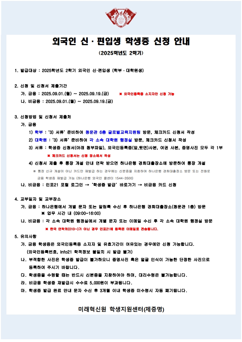 [학생증] 2025학년도 2학기 외국인 신·편입생 학생증 신청안내