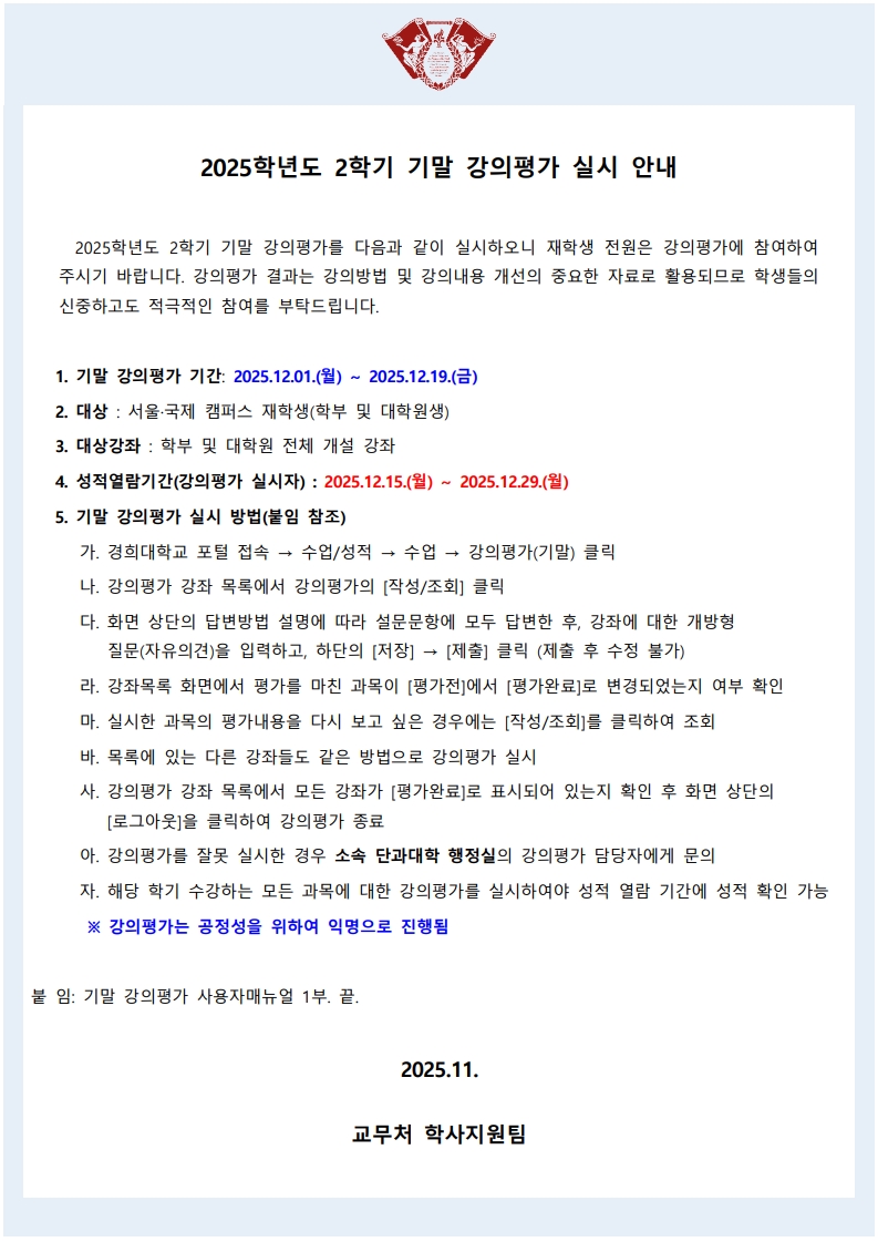2025학년도 2학기 기말 강의 평가 안내를 아래와 같이 드립니다.