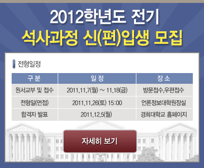 2012학년도 전기 석사과정 신(편)입생 모집 등록일 11-10-18 10:33 작성자 디자이너™ 조회수 9,878 이전글2011-2 학생증 발급 명단 (6차) 다음글 [입시] 2012학년도 전기 석사과정 신(편)입생 모집 목록