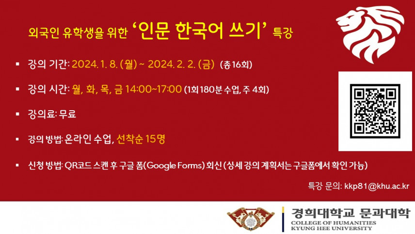 경희대학교 문과대학에서는 외국인 유학생을 위한 '인문 한국어 쓰기' 특강을 아래와 같이 실시합니다.