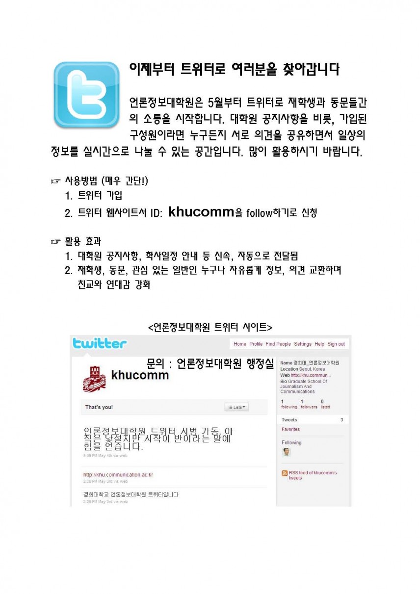 언론정보대학원, twitter 안내 등록일 10-05-06 16:21 작성자 행정실 조회수 11,204 이전글개교기념일(5.18) 휴무 안내 다음글 전공필수종합시험 출제교수 공지 및 Tip (최종) 목록