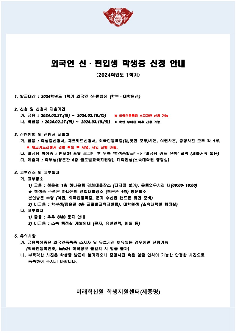 [학생증] 2024학년도 1학기 외국인 신·편입생 학생증 신청안내(기간 변경)
