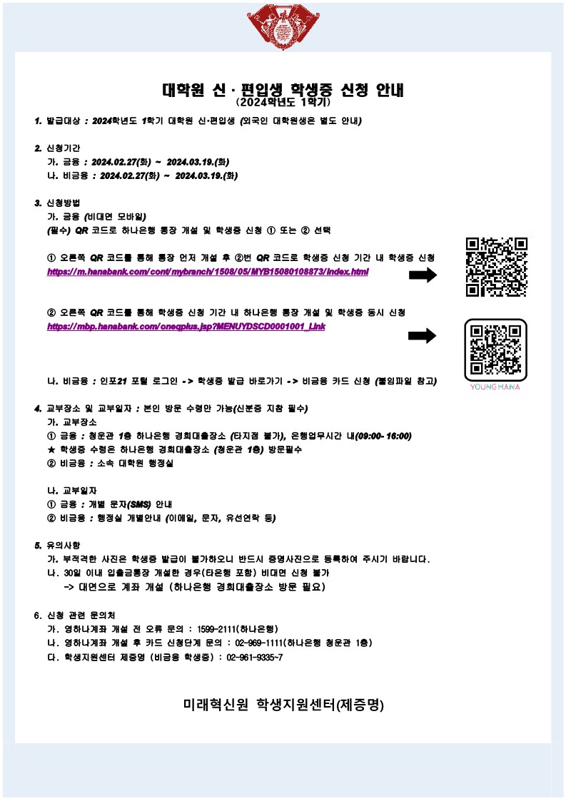 [학생증] 2024학년도 1학기 대학원 신·편입생 학생증 신청안내(기간 변경) 등록일 24-02-16 15:22 작성자 media 조회수 3,415 하나은행 비대면 학생증 체크카드 신청 프로세스.pdf (다운로드횟수:1205) 인포21 비금융 학생증 신청 프로세스.pdf (다운로드횟수:1127) 하나은행 경희대 학생증 혜택 카드뉴스.pdf (다운로드횟수:1367) 이전글[대외협력처] 2023학년도 전기 졸업생 대상 기부 이벤트(~02/18) 다음글 [학생증] 2024학년도 1학기 외국인 신·편입생 학생증 신청안내(기간 변경) 목록