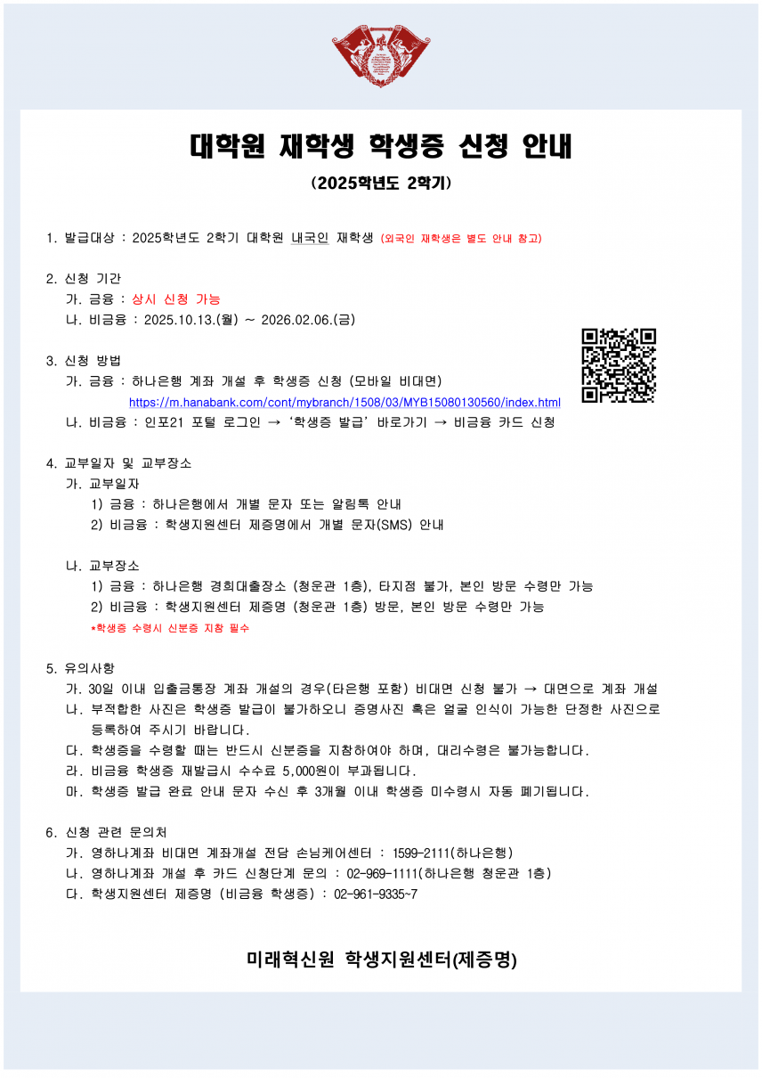 1) 교부안내 : 하나은행 경희대출장소(청운관 1층)