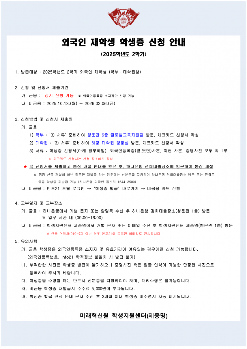 2) 비금융 : 필요서류 없음 / 추후 학생증 수령시 본인 확인용 신분증 및 문자 또는 메일 수신 확인