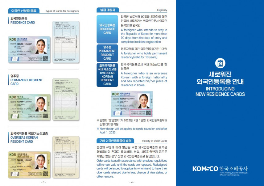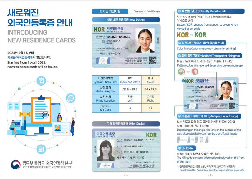 신형 외국인등록증 발급 안내 등록일 23-03-29 09:08 작성자 media 조회수 4,030 신형 외국인등록증 안내 리플렛A4.pdf (다운로드횟수:1974) 법무부에서는 국내 장기체류 외국인에게 발급하는 외국인등록증*(영주증, 외국국적동포국내거소신고증 포함)의 편의성과 활용성 향상을 위해 2023. 4. 1.부터 새로운 디자인의 외국인등록증을 발급할 예정입니다. (법령에 규정된 각종 절차와 거래관계 등에서 주민등록증과 같은 효력이 있음 ) 이와 관련, 법무부에서 신형 외국인등록증 디자인 개선 사항 등에 대한 이해를 돕고자 붙임과 같이 제작한 홍보자료를 안내드리니 참고해주시기 바랍니다. 이전글[논문] 2023-1학기 논문예비계획서 제출안내(4기 이상) 다음글 [학위자격시험] 2023학년도 1학기 전공기초학위자격시험(커뮤니케이션이론(박장희교수님)) TIP 공지 목록