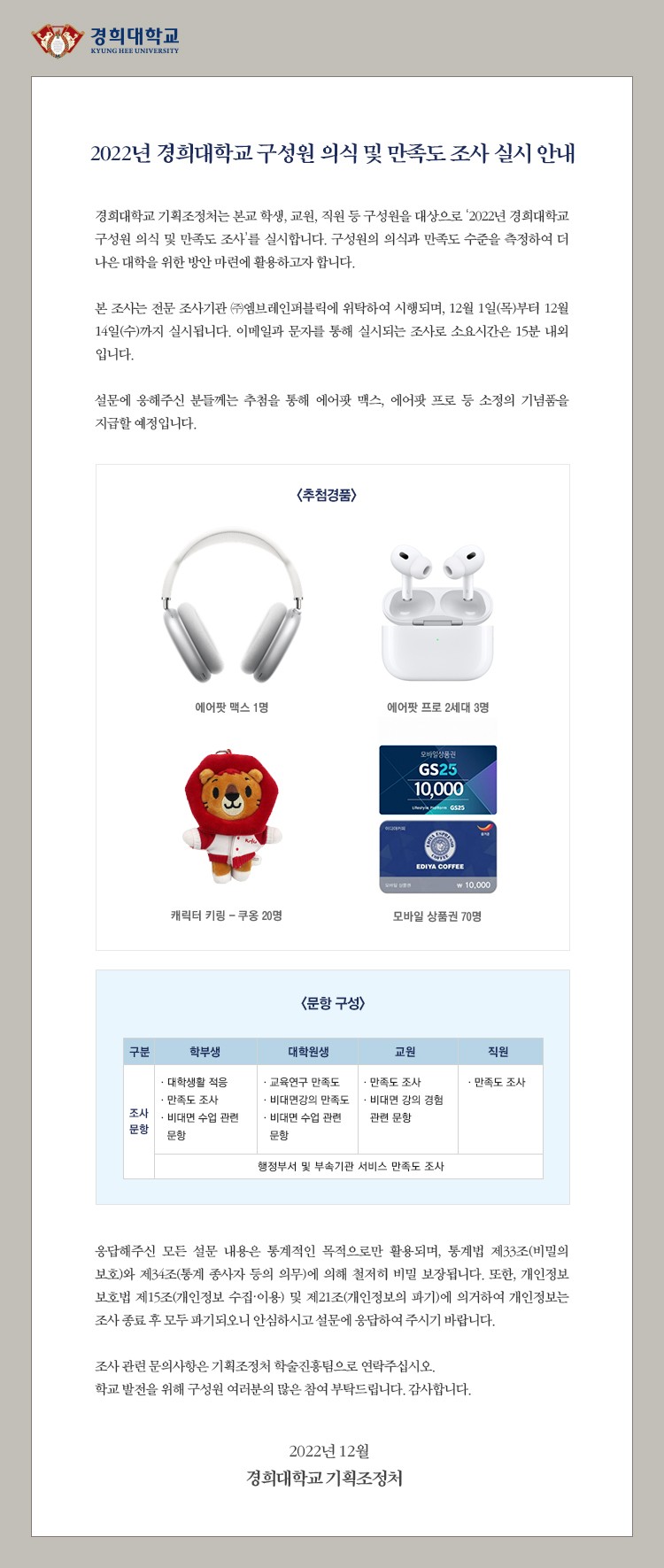 1) 조사명 : 경희대학교 구성원 인식 및 만족도 조사