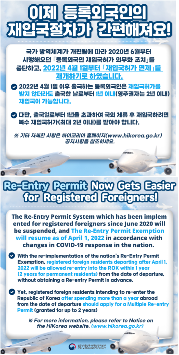※ 단, 2022.4.1 이전 출국자는 재입국허가를 받고 출국했어야지만 재입국 가능합니다. 재입국 허가를 받지 않고 출국 했을 경우 현재 비자는 자동 종료됩니다.