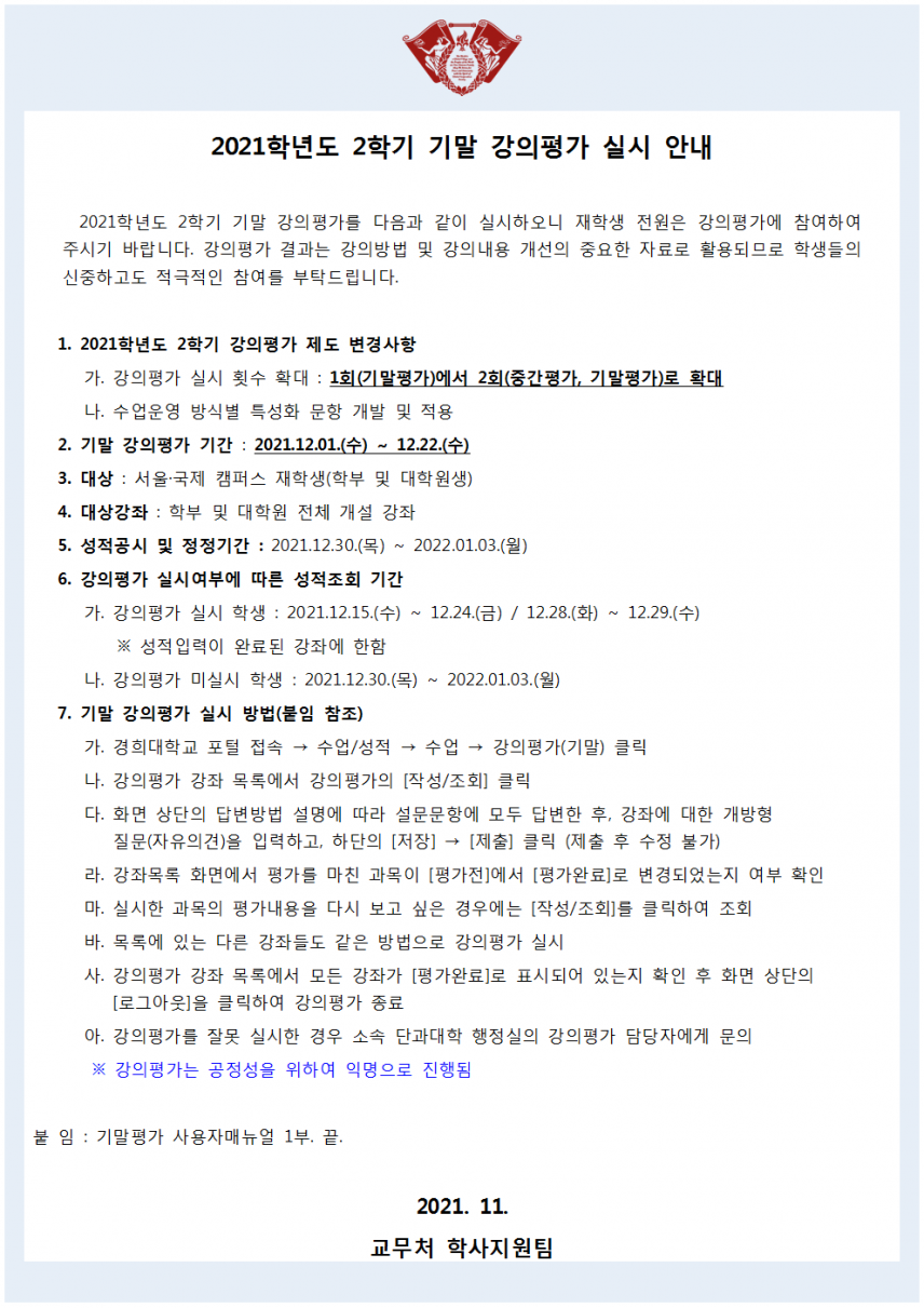 2021학년도 2학기 기말 강의평가 시행 안내 등록일 21-11-18 13:44 작성자 media 조회수 5,933 [붙임5]2021-2학기 기말 강의평가 사용자매뉴얼학생용.pdf (다운로드횟수:1852) 이전글[논문]2021학년도 2학기 졸업자 학위논문 중앙도서관 제출 안내 다음글 2021학년도 2학기 서울캠퍼스 교무처 교무팀 조교 모집 목록