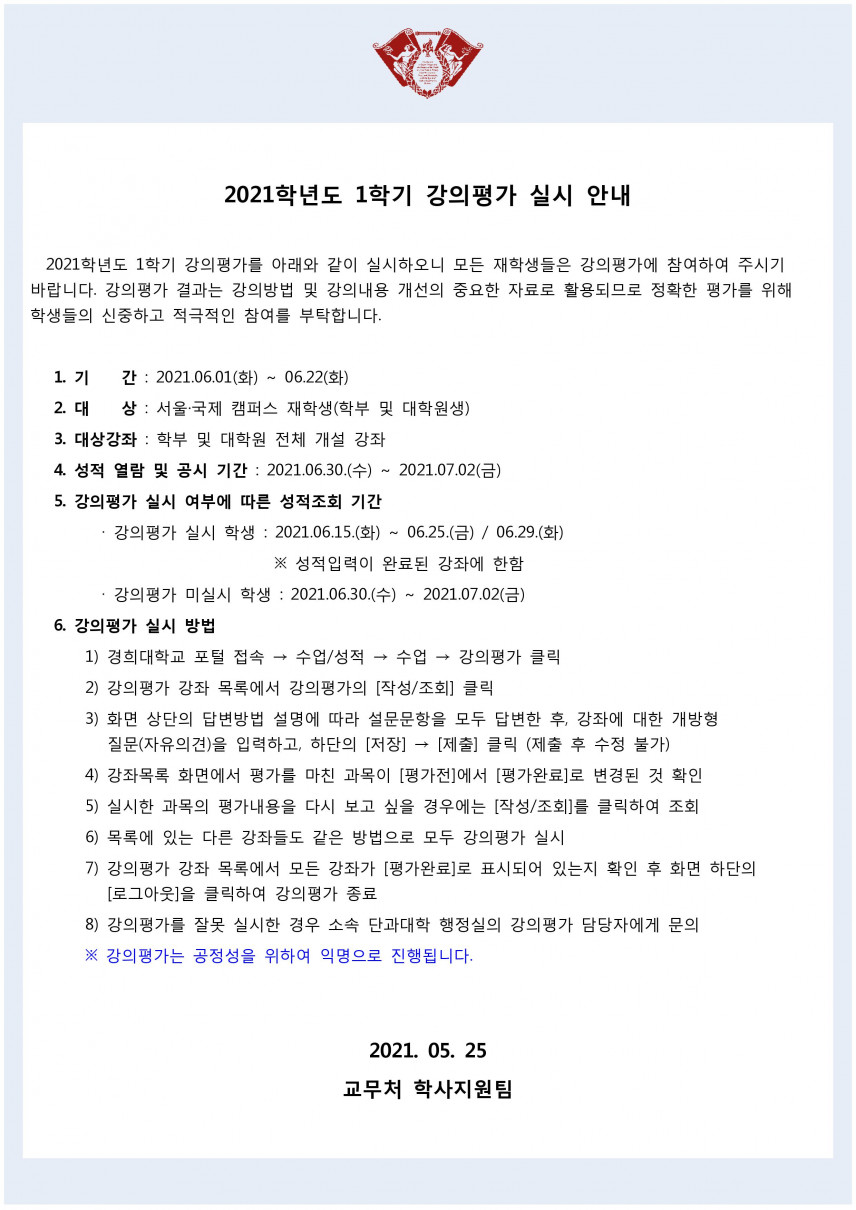 [중요] 2021학년도 1학기 강의평가 실시 안내 등록일 21-05-26 13:10 작성자 media 조회수 9,130 이전글2021학년도 후기 미디어커뮤니케이션대학원 신(편)입생 합격자 발표 및 등록 안내 다음글 2021학년도 1학기 전공필수종합시험 과목별 팁 2 목록