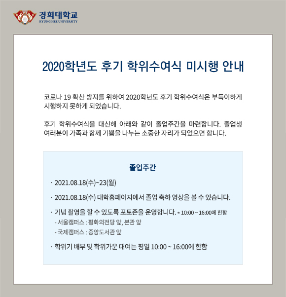 [학위수여식] 2020학년도 후기 졸업주간 건물출입 안내 등록일 21-08-18 10:01 작성자 media 조회수 7,337 이전글2021학년도 후기입시 신입생 최종 등록 기간 안내 다음글 [학위수여식] 2021년 8월 졸업예정자 석사 가운 대여 및 관련 안내 목록