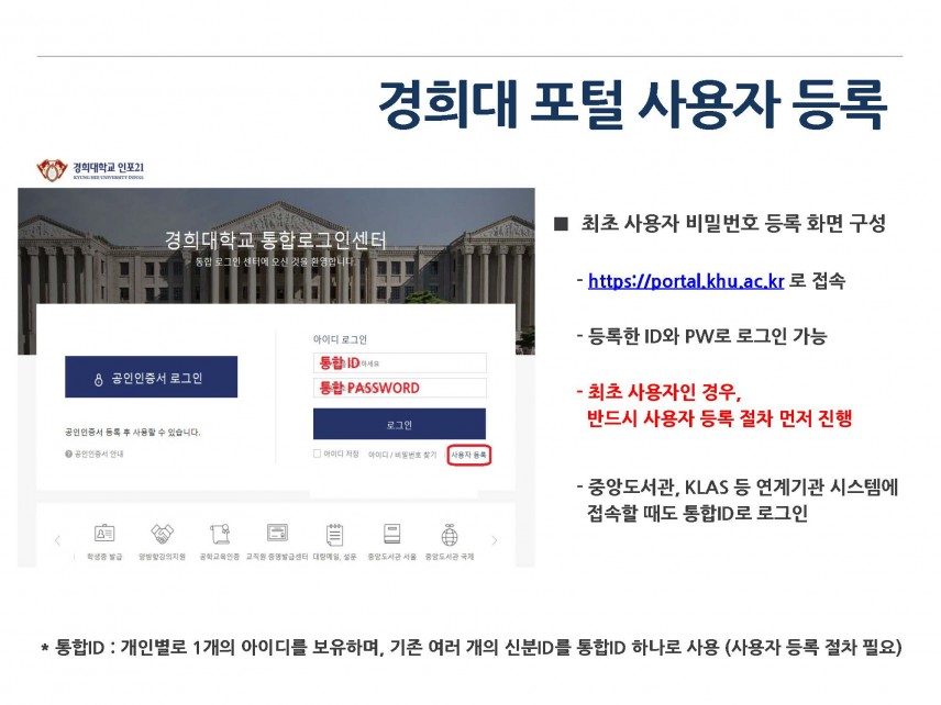 [참고] 경희대 포털 사용자 등록 등록일 20-09-03 21:04 작성자 행정실 조회수 11,767 경희대 포털 사용자 등록 이전글2020학년도 2학기 전공기초 종합시험 실시안내 다음글 [수업] 수강정정과목이 e-campus에 노출되지 않는 현상 관련 목록