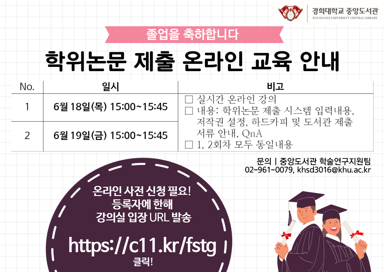 마. 문의: 중앙도서관 학술연구지원팀(961-0079, khsd3016@khu.ac.kr)