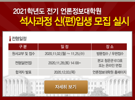 2021학년도 전기 석사과정 신(편)입생 모집 등록일 19-12-09 10:22 작성자 디자이너™ 조회수 9,890 이전글[채용공고] 미래문명원 글로벌봉사팀 계약직 모집 다음글 2020학년도 전기 언론정보대학원 석사과정 신(편)입생 수시전형 모집 목록