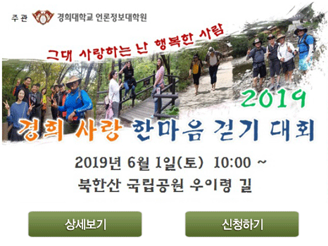 2019 경희 사랑 한마음 걷기 대회 안내 등록일 19-05-07 10:26 작성자 웹관리자 조회수 10,257 . 이전글2019학년도 1학기 논문 심사 및 서류 제출 일정 안내 다음글 2019 경희 사랑 한마음 걷기 대회 안내(세부사항은 추후공지) 목록