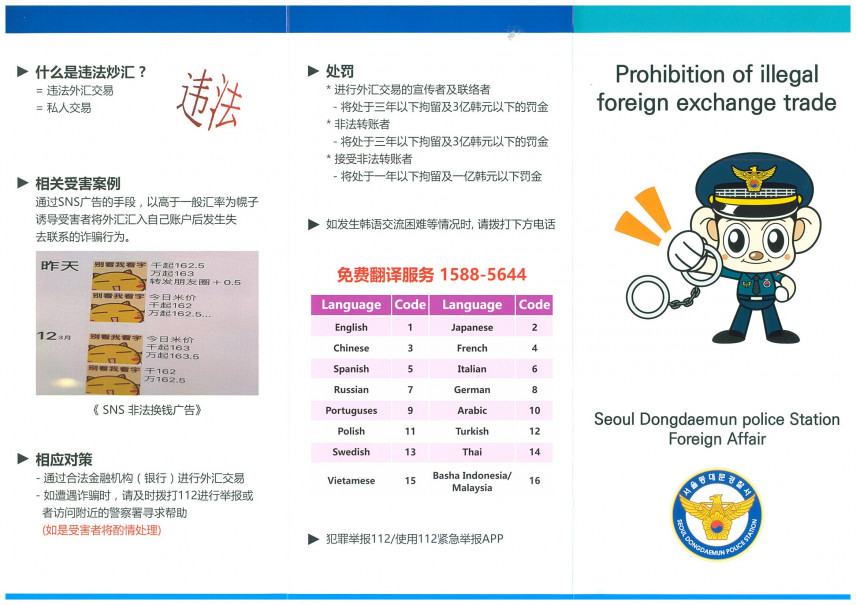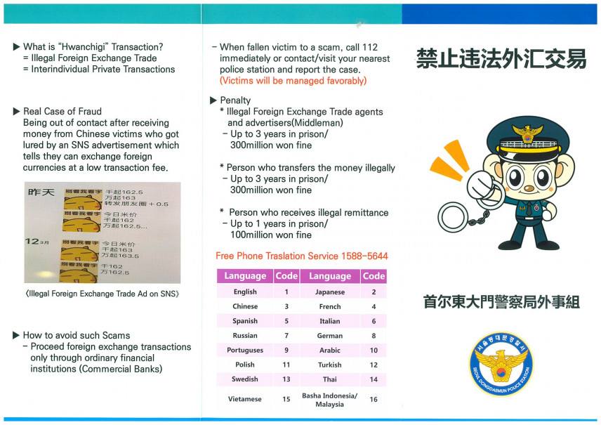 현재 국내 체류 외국인 유학생들의 불법외환거래(환치기)가 급증하여 많은 문제를 야기하고 있는 관계로 피해예방을 위해 동대문경찰서의 홍보 리플릿을 게재합니다.