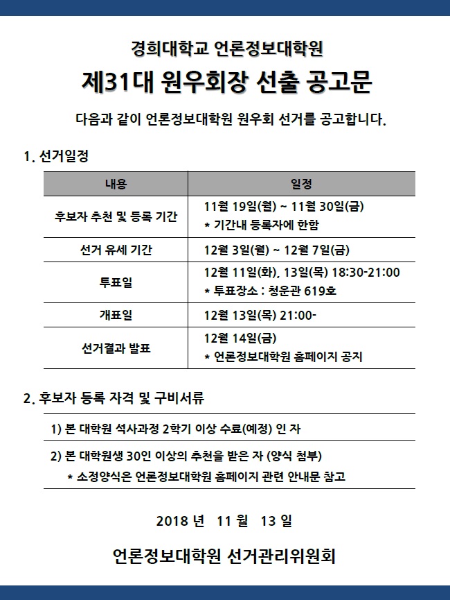 제31대 언론정보대학원 원우회 선거 일정 안내 등록일 18-11-13 14:21 작성자 행정실 조회수 10,891 2018_언론정보대학원_원우회_입후보_신청서_및_추천서_2.hwp (다운로드횟수:4488) 이전글2018학년도 2학기 전공필수종합시험 합격 조회 안내 다음글 2018학년도 2학기 논문 심사 및 서류 제출 일정 안내 목록