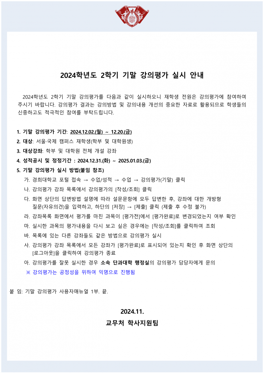 [강의평가] 2024학년도 2학기 기말강의평가 안내 등록일 24-11-27 15:40 작성자 media 조회수 3,015 기말 강의평가 사용자매뉴얼학생용.pdf (다운로드횟수:826) 안녕하세요. 미디어커뮤니케이션대학원 행정실입니다.2024학년도 2학기 기말 강의 평가 안내를 아래와 같이 드립니다.첨부파일로 기말 강의평가 사용자 매뉴얼(학생용) 같이 첨부드리니 참고하시기 바랍니다.감사합니다. 이전글2024년 경희대학교 구성원 의식 및 만족도 조사 다음글 [논문] 논문관련 ZOOM 워크숍 홍보안내 목록