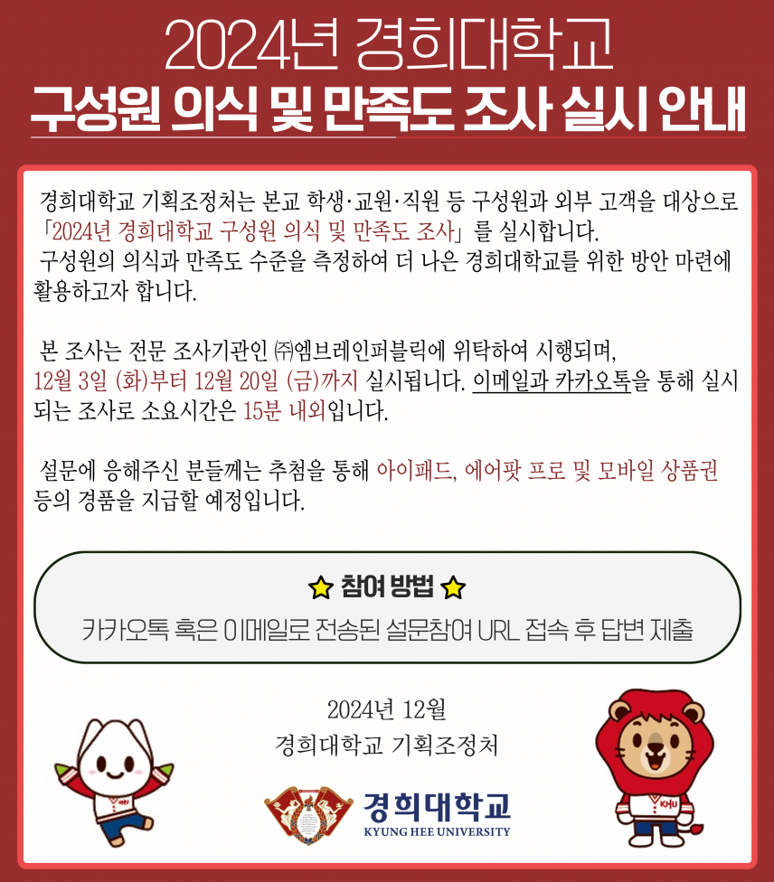 2024년 경희대학교 구성원 의식 및 만족도 조사 등록일 24-11-28 09:52 작성자 media 조회수 2,958 안녕하십니까 미디어커뮤니케이션대학원 입니다.2024년 경희대학교 구성원 의식 및 만족도 조사가 이뤄질 예정입니다.- 기간 : 12.03.(화) ~ 12.20.(금)- 방법 : 이메일&카카오톡으로 url 발송 예정해당내용 참고 하시고 많은 참여 부탁드립니다. 이전글외국인 유학생 취업매칭 플랫폼 정식 오픈 다음글 [강의평가] 2024학년도 2학기 기말강의평가 안내 목록