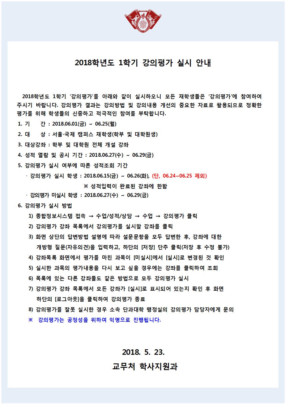 [중요] 2018학년도 1학기 강의평가 실시 안내 등록일 18-05-24 19:11 작성자 행정실 조회수 11,008 [붙임]_강의평가_실시_안내문(학사공지)_1.pdf (다운로드횟수:4242) [붙임]_강의평가_실시_안내문(학사공지)_1.hwp (다운로드횟수:4311) 이전글경희대학교 LINC+사업단 페이스북 오픈 이벤트 다음글 2018학년도 1학기 전공필수종합시험 합격 조회 안내 목록