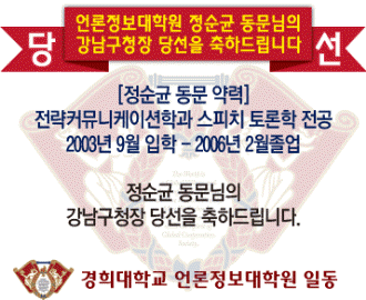 축-당선 정순균 동문님 등록일 18-06-14 15:30 작성자 웹관리자 조회수 8,844 이전글2018학년도 후기 언론정보대학원 신(편)입생 모집 실시 다음글 축-당선 이승미 동문님 목록