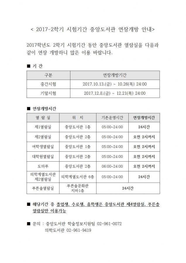 2017-2학기 시험기간 중앙도서관 연장개방 안내 등록일 17-10-10 10:02 작성자 행정실 조회수 11,090 이전글2017학년도 2학기 전공필수 종합시험 실시안내 다음글 2017학년도 2학기 전공기초 종합시험 과목별 팁 목록