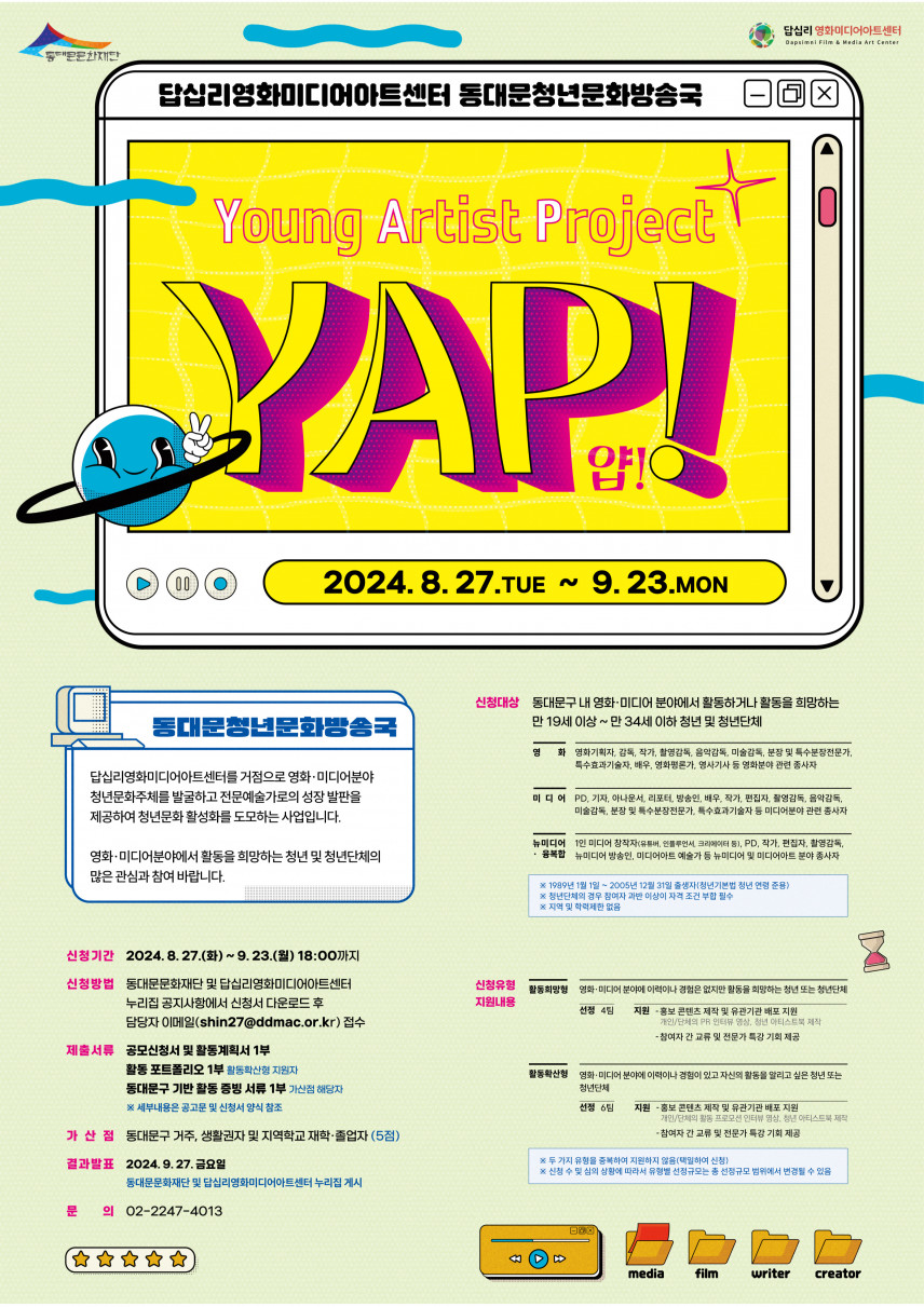 (재)동대문문화재단은 답십리영화미디어아트센터를 거점으로 영화·미디어 분야 청년들을 발굴하고 전문가로 성장 및 활동 발판을 제공하여 청년문화 활성화를 도모하기 위해
