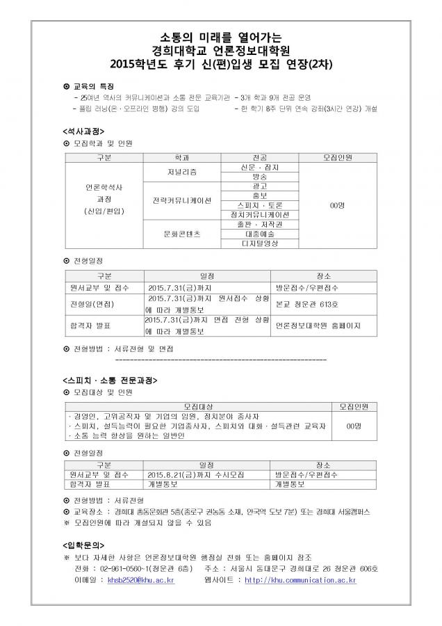 2015학년도 후기 석사과정 신입생 2차 모집 연장 등록일 15-07-14 09:58 작성자 행정실 조회수 11,029 apply_2015_4.hwp (다운로드횟수:3872) 이전글2015학년도 후기 언론정보대학원 2차 모집 연장 다음글 2015-2학기 언론정보대학원 목련장학 선발 안내 목록