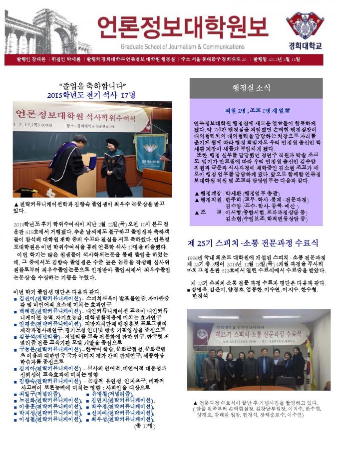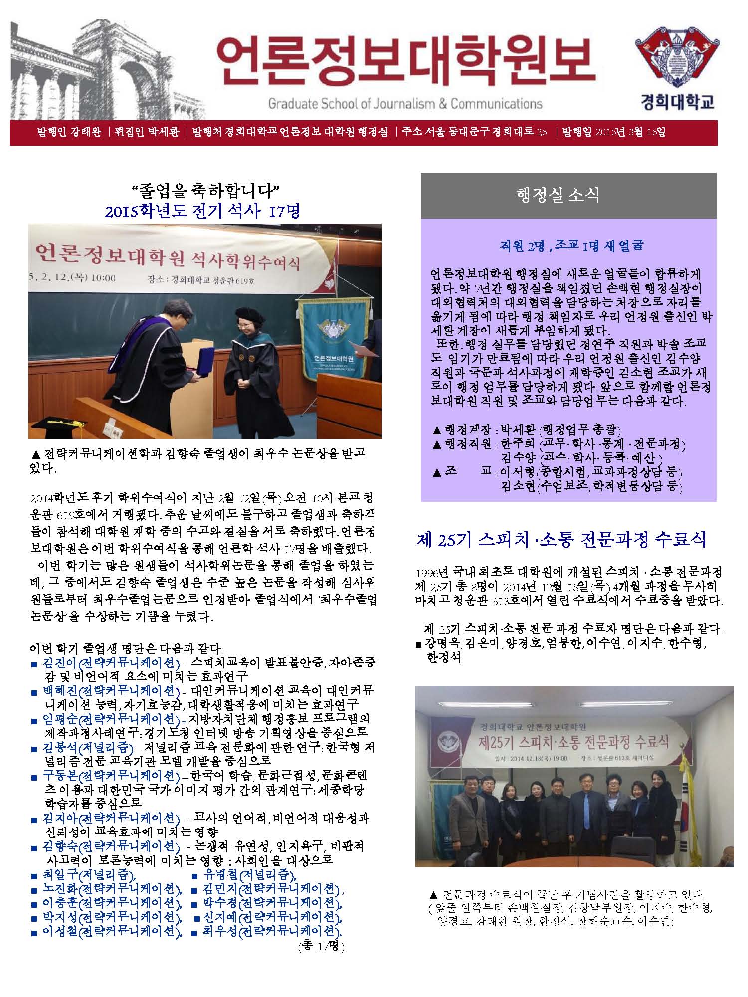 언론정보대학원보 등록일 15-03-13 09:54 작성자 행정실 조회수 10,629 이전글[강의실 변경] 미디어글쓰기 강의실 변경 다음글 [강의실변경] 연구방법론 강의실 변경안내 목록