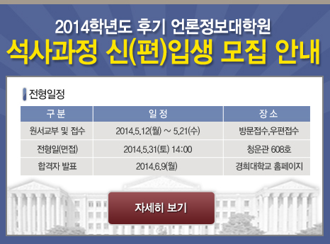 석사과정 신(편)입생 모집 안내 등록일 14-05-07 14:46 작성자 디자이너™ 조회수 9,066 이전글2014학년도 후기 언론정보대학원 '스피치·소통 전문과정' 모집 안내 다음글 [종합시험] 2014-1 전공필수 종합시험 실시 안내 (출제교수 및 tip) 목록