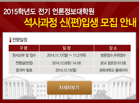 석사과정 신(편)입생 모집 안내 등록일 14-11-05 10:12 작성자 디자이너™ 조회수 9,752 이전글언론정보대학원 미래만들기 관련 안내입니다. 다음글 제27대 언론정보대학원 원우회 선거 일정 안내 목록