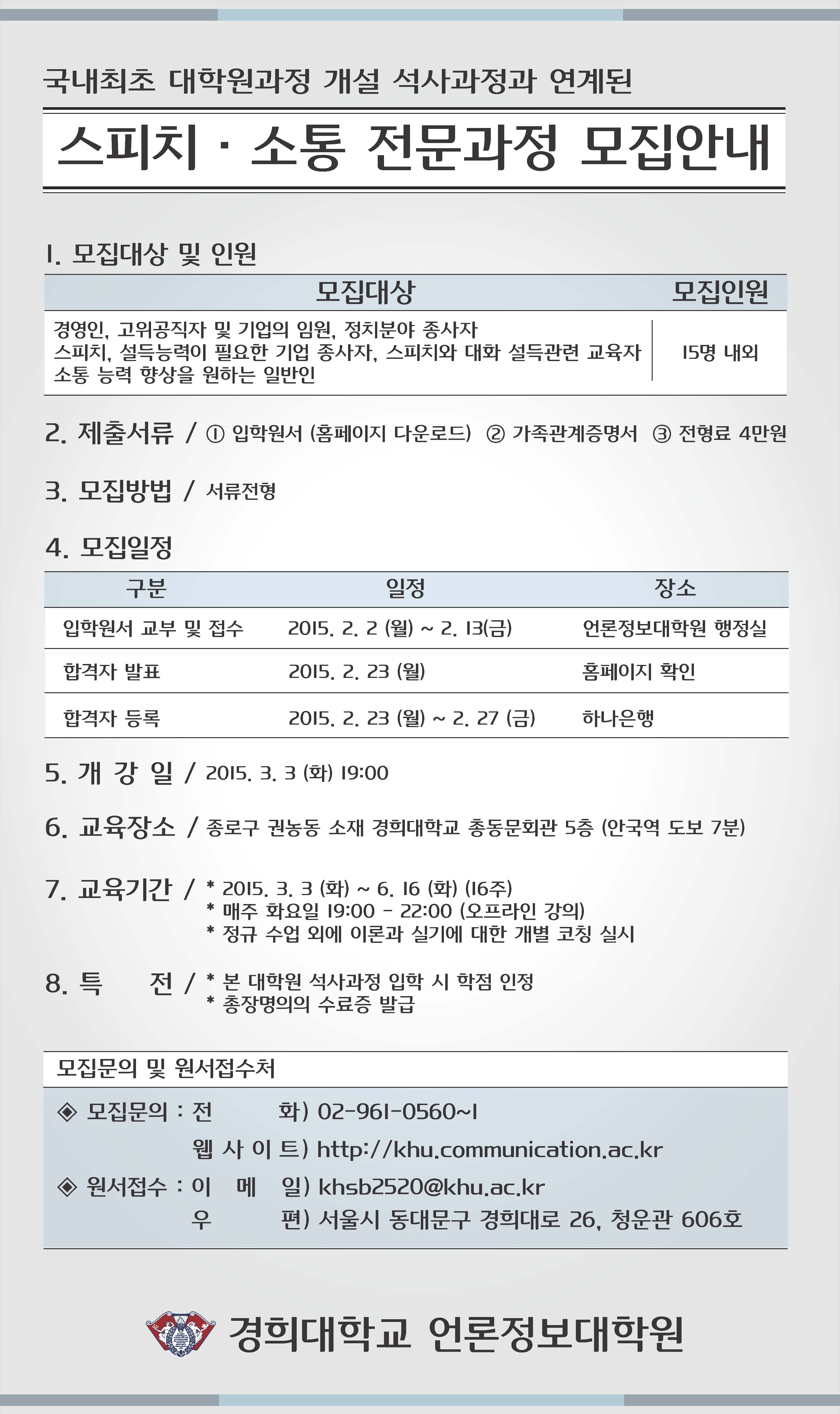 2015학년도 전기 언론정보대학원 '스피치·소통 전문과정' 모집 안내 등록일 14-11-11 13:32 작성자 행정실 조회수 11,837 전문과정원서&개인정보동의서_4.hwp (다운로드횟수:4530) 이전글스피치·소통 전문과정 모집 안내 다음글 언론정보대학원 미래만들기 관련 안내입니다. 목록