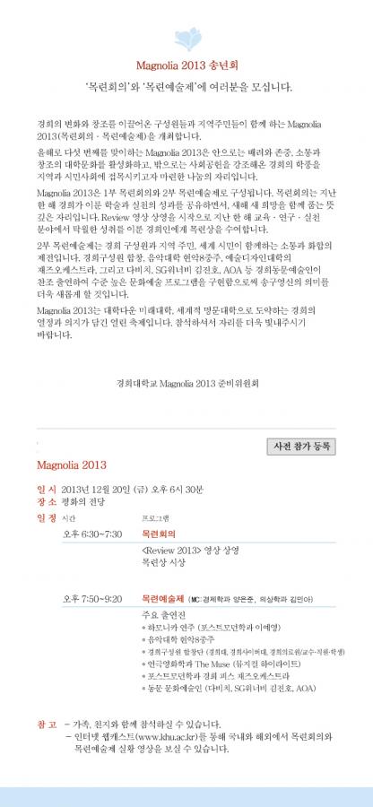 경희대학교 송년회 'Magnolia 2013'에 초청합니다. 등록일 13-12-13 17:26 작성자 행정실 조회수 10,407 이전글2014학년도 전기 언론정보대학원 '스피치·소통 전문과정' 모집 안내 다음글 [언론문화세미나: 사진과 사회] 기획 사진전 목록