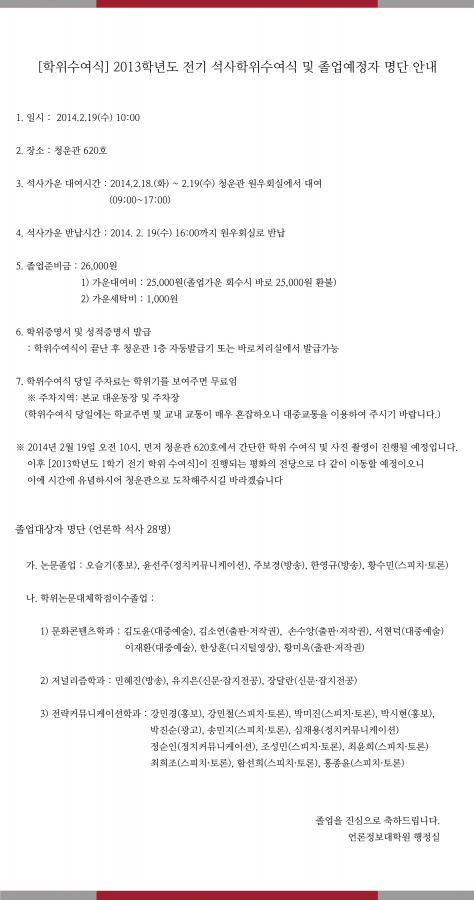 [학위수여식] 2013학년도 전기 석사학위수여식 및 졸업예정자 명단 안내 등록일 14-02-06 13:43 작성자 행정실 조회수 10,570 이전글[수강신청] 2014학년도 1학기 수강신청 일정 공지 다음글 [재학생등록] 2014학년도 1학기 재학생 등록기간 안내 목록