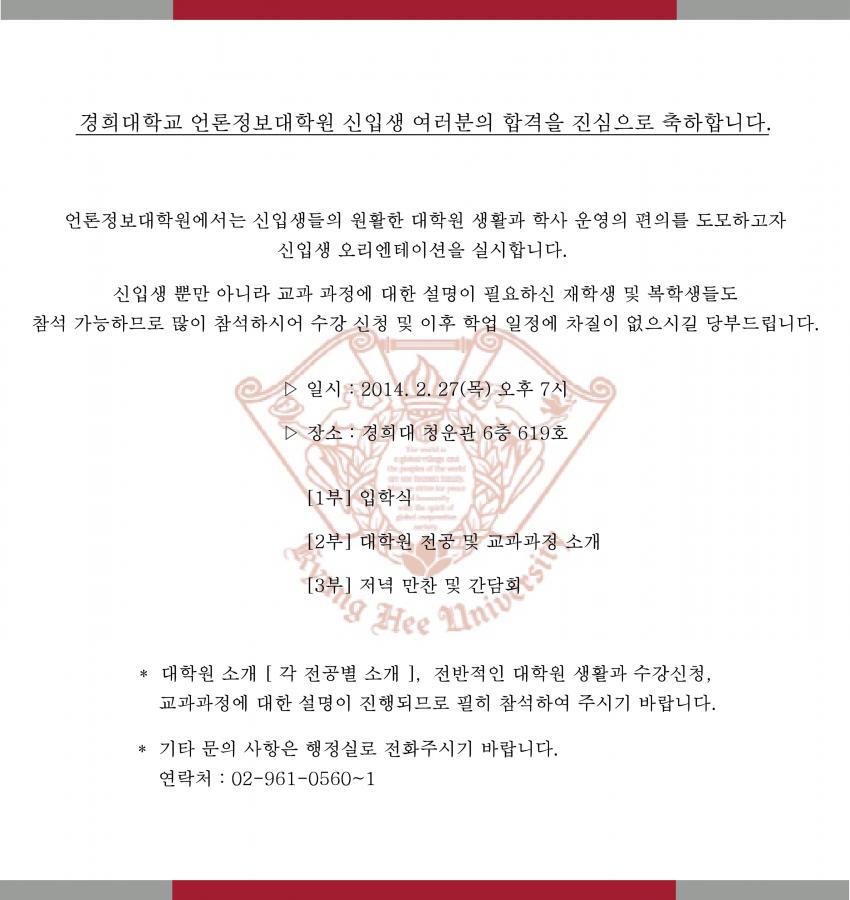 2014-1학기 신입생 입학식 및 오리엔테이션 안내 등록일 14-02-14 18:18 작성자 행정실 조회수 10,569 이전글[신.편입생] 학생증발급안내 - 학번첨부 다음글 [수강신청] 2014학년도 1학기 수강신청 일정 공지 목록
