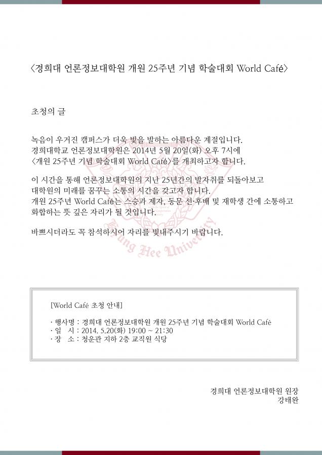 언론정보대학원 개원 25주년 기념 학술대회 [World café]를 개최합니다. 등록일 14-05-13 16:33 작성자 행정실 조회수 9,963 이전글[논문] 2014-1학기 논문 예비계획서 합격자 발표 다음글 2014학년도 후기 언론정보대학원 스피치·소통 전문과정 모집 목록