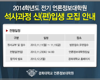 2014학년도 전기 석사과정 신(편)입생 모집 안내 등록일 13-10-17 15:40 작성자 디자이너™ 조회수 9,639 이전글[종합시험] 2013-2 전공필수 종합시험 실시 안내 (출제교수 및 tip) 다음글 [입시] 2014학년도 전기 석사과정 신(편)입생 모집 목록