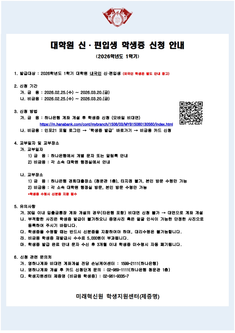 [학생증] 2026학년도 1학기 대학원 신·편입생 학생증 신청안내(재안내) 등록일 26-02-10 15:35 작성자 media 조회수 241 2026학년도 학생증 체크카드 카드뉴스일정 변경.pdf (다운로드횟수:12) 인포21 비금융 학생증 신청 프로세스.pdf (다운로드횟수:9) *신청기간이 변경되었으니 확인 바랍니다. 이전글[학생증] 2026학년도 1학기 외국인 신·편입생 학생증 신청안내(재안내) 다음글 [등록] 2026학년도 1학기 재학생 및 복학생 등록기간 안내 목록