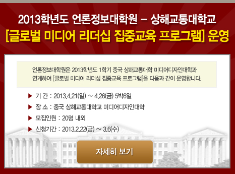 글로벌 미디어 리더십 집중교육 프로그램 안내 등록일 13-02-22 11:36 작성자 디자이너™ 조회수 9,911 이전글2013학년도 1학기 수강신청 공지 안내 다음글 [언론정보대학원-상해교통대학 미디어디자인대학] 글로벌 미디어 리더십 집중교육 프로그램 안내 목록